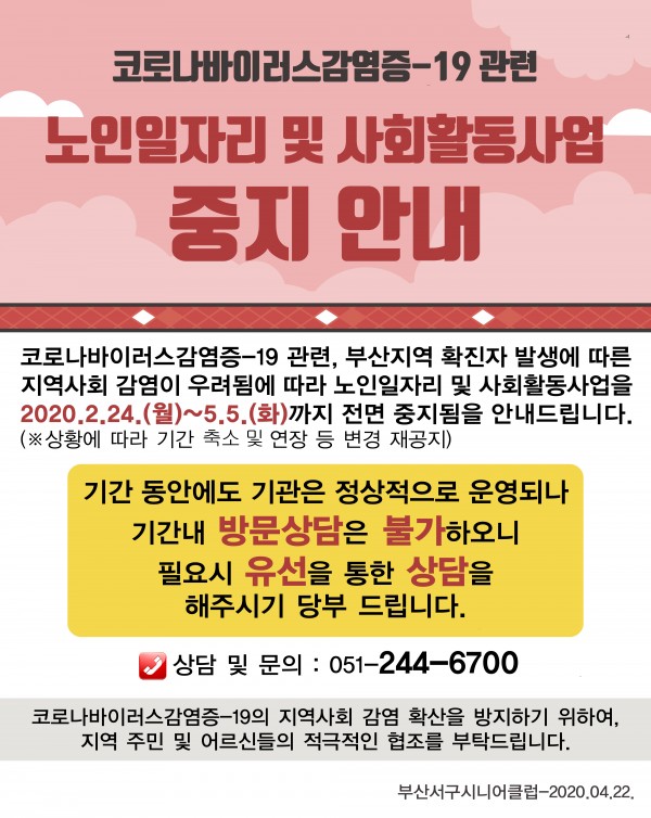 [코로나-19로 인한 노인일자리 및 사회활동사업 중단 기간 변경 안내]