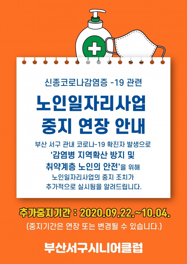 공지사항 HOME 커뮤니티 공지사항 공유하기 인쇄하기 코로나-19 관련 노인일자리사업 중지 연장 알림 페이지 정보 작성자 부산서구시니어클럽 댓글 0건 조회 11,462회 작성일 20-09-24 13:23 본문 코로나감염증-19 관련 노인일자리사업 중지 연장 안내 목록 이전글부산서구시니어클럽 3차 추가경정 세입세출예산서 공고 20.10.23 다음글부산서구시니어클럽 2020년 수의계약 정보 공개 20.09.23 댓글목록 댓글목록 등록된 댓글이 없습니다.