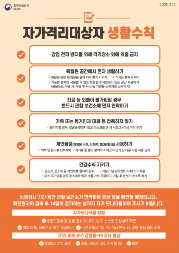 포토에세이 HOME STORY 포토에세이 공유하기 인쇄하기 자가격리 대상자 생활수칙 페이지 정보 작성자 부산서구시니어클럽 댓글 0건 조회 10,776회 작성일 20-04-03 11:00 본문 자가격리 대상자 생활수칙 목록 이전글자가격리 대상자 가족 및 동거인 생활수칙 20.04.03 다음글코로나바이러스감염증-19 예방 [꼭! 기억해야 할 행동수칙] 20.04.03 댓글목록 댓글목록 등록된 댓글이 없습니다.