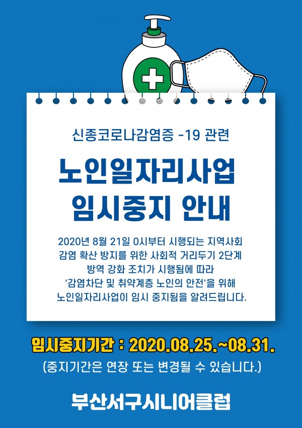노인일자리사업 임시 중지 안내 페이지 정보 작성자 부산서구시니어클럽 댓글 0건 조회 11,310회 작성일 20-08-25 10:04 본문 노인일자리사업 임시 중지 안내 목록 이전글노인일자리사업 중지 안내 20.08.28 다음글행복한작업장사업단 참여자 활동사진 20.06.16 댓글목록 댓글목록 등록된 댓글이 없습니다.