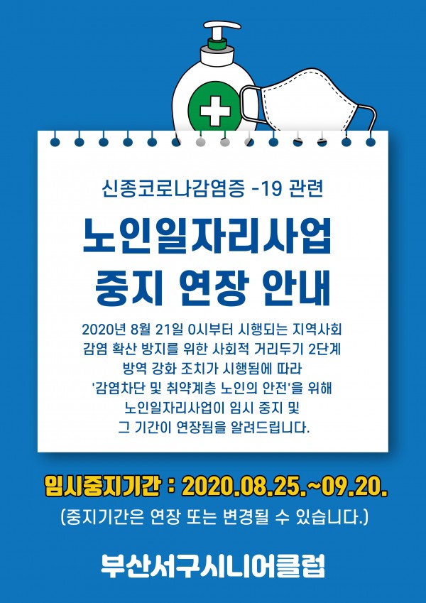 노인일자리 임시중단 알림 페이지 정보 작성자 부산서구시니어클럽 댓글 0건 조회 11,253회 작성일 20-09-09 12:02 본문 코로나-19 관련 노인일자리 임시중단 알림 목록 이전글2단계 사회적 거리두기 재연장_부산광역시 20.09.18 다음글노인일자리사업 중지 안내 20.08.28 댓글목록 댓글목록 등록된 댓글이 없습니다.