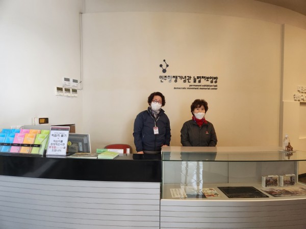 민주공원도슨트사업단 참여 어르신 상설전시관 안내데스크 근무 사진입니다.