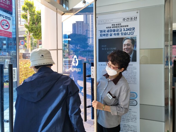 시니어금융업무지원사업단 참여자 새마을금고 이용 고객 배웅하는 사진입니다.