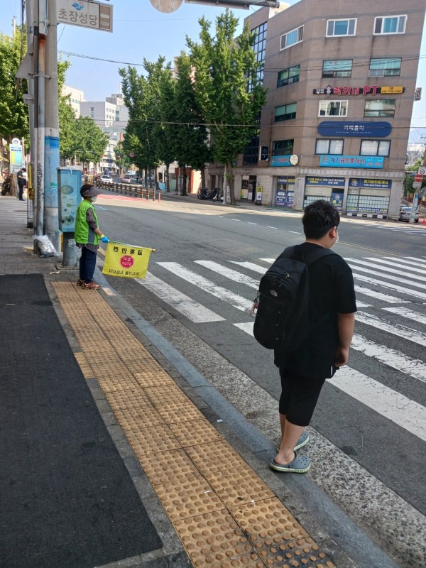 아이들의 등하교 시 스쿨존 내에서 안전하게 길을 건널 수 있도록 어르신들이 깃대를 들었습니다.